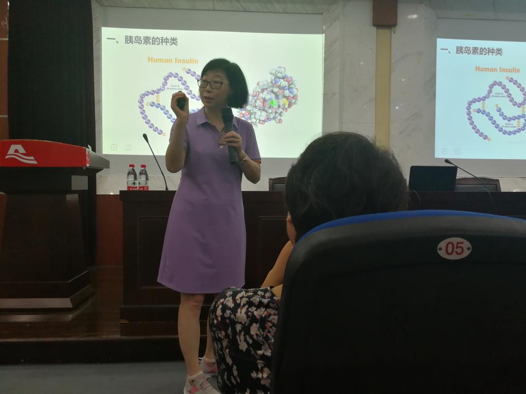 第二场,学院副院长陈三妹教授作《胰岛素的临床应用》讲座。陈教授以通俗易懂的方式深入浅出的介绍了胰岛素种类、胰岛素注射部位、注射针头的选用、注射技术教育、胰岛素笔的使用、胰岛素的保存等,并提醒同学们临床时的一些“小问题”可能会造成“大风险”。