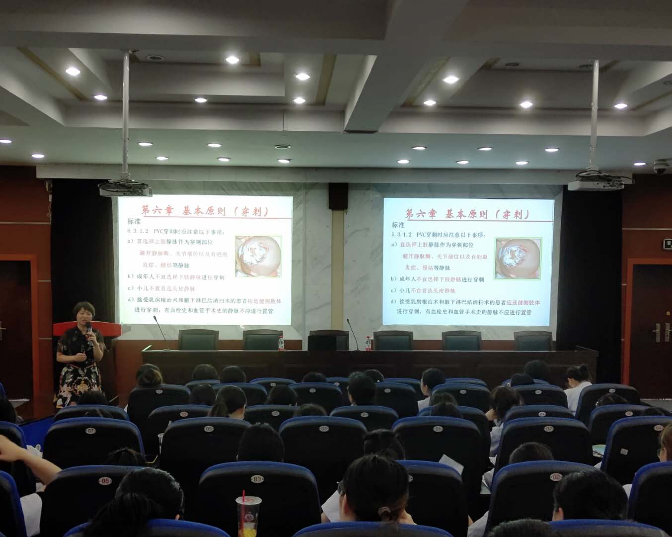 第一场,浙江大学硕士生导师、浙江大学开云电子竞技官方网站附属第二医院大科护士长赵锐祎主任护师首先讲授《静脉治疗护理技术操作规范的解读与实践》。赵锐祎主任护师兼任中华护理学会静脉输液治疗专业委员会委员,浙江省护理学会静脉输液专业委员会副主任委员,卫生部“中华人民共和国静脉输液治疗操作标准”制定组成员,在静脉输液治疗行业内具有较大影响力。赵锐祎主任护师结合浙二医院近几年的静疗实践,详细解读了静脉治疗的行业标准和规范。并与同学们积极互动,使大家对“药物渗出和外渗的区别、“导管相关性血流感染”,“静脉药物配置”,“静疗并发症以及抗肿瘤药物的防护”等有了更清晰的认识。