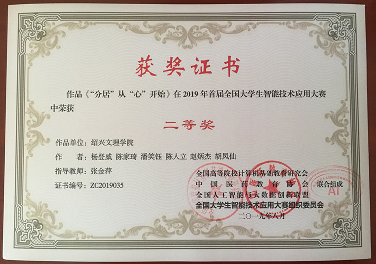 大赛内容紧紧围绕人工智能、大数据、云计算、虚拟现实、物联网、机器人等前沿技术应用领域展开。由张金萍教授指导,我院临床医学174班杨登威同学负责的《“分居”从“心”开始》经过激烈角逐,最终荣获大赛二等奖。