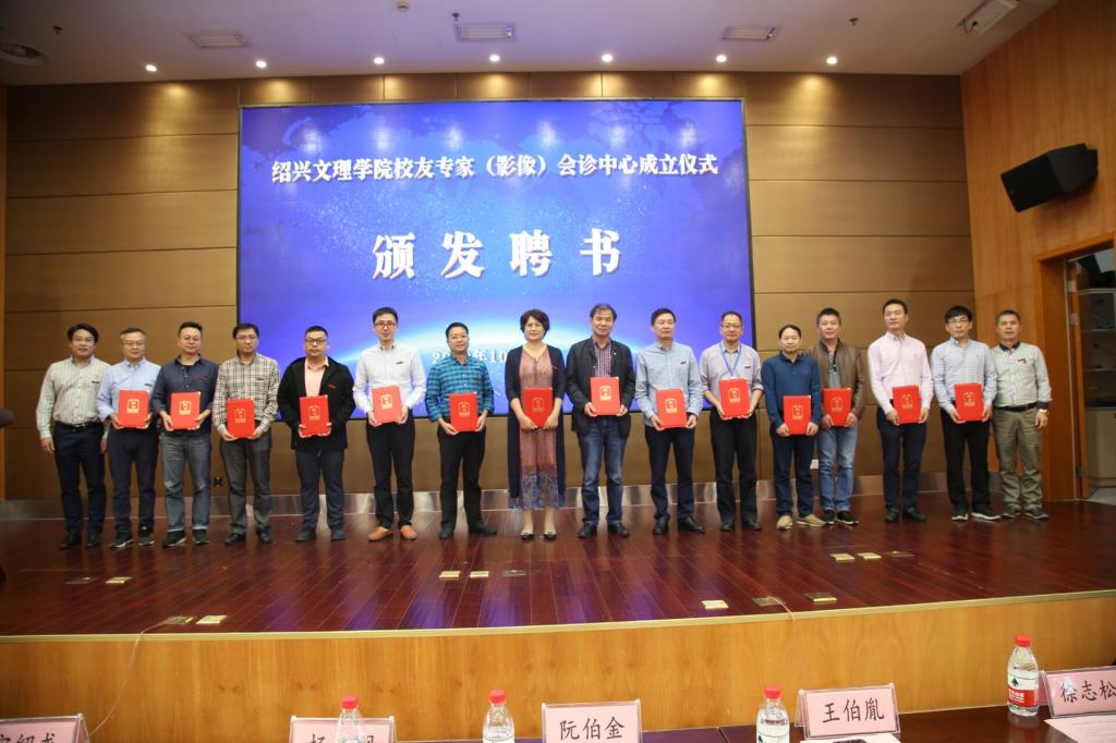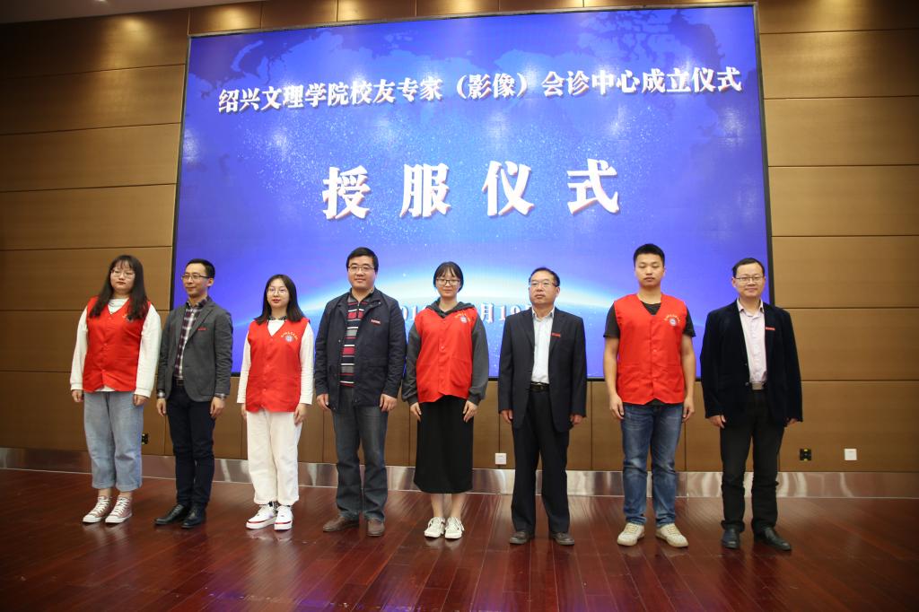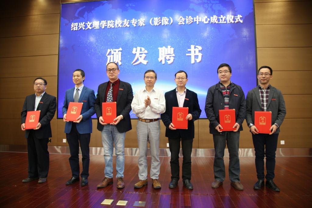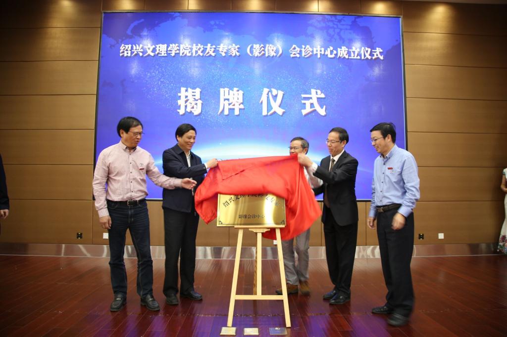 宣绍龙部长、杨大明副会长、阮伯金处长、张伟阳院长、王伯胤教授、夏瑞明书记共同为绍兴文理学院校友专家(影像)会诊中心揭牌。