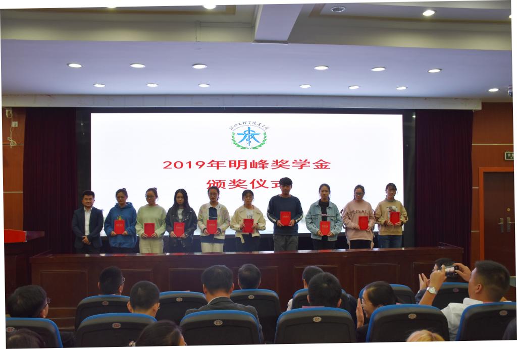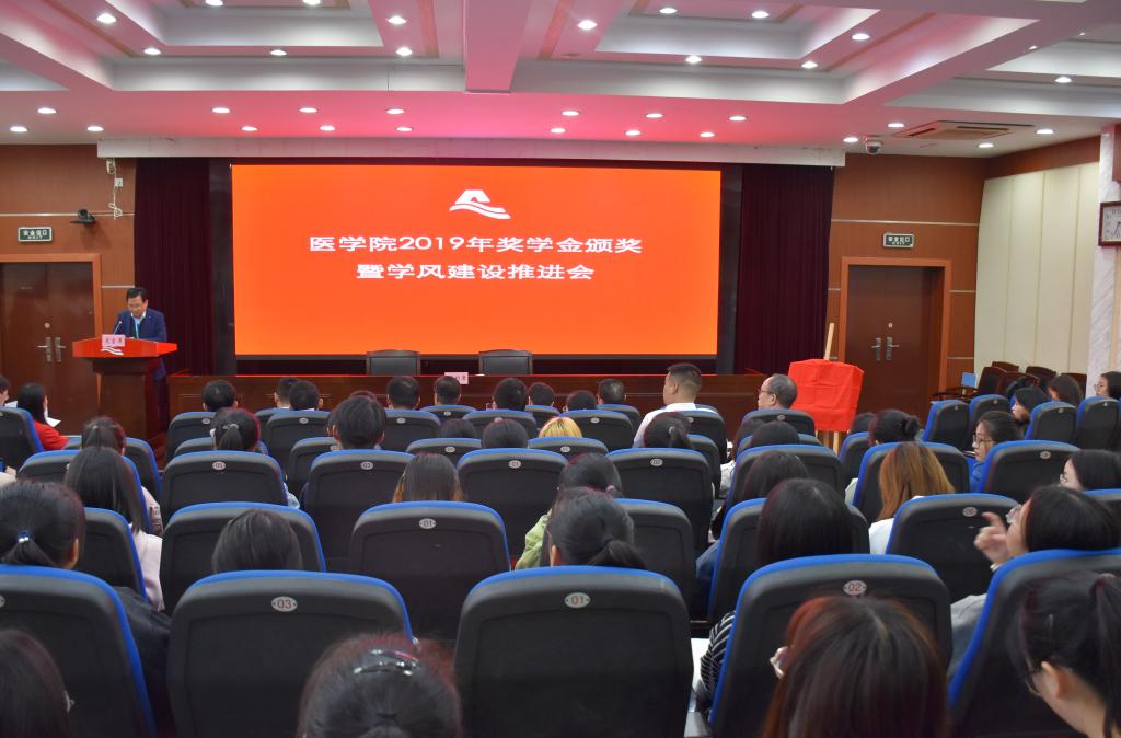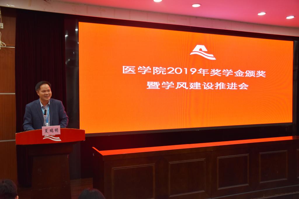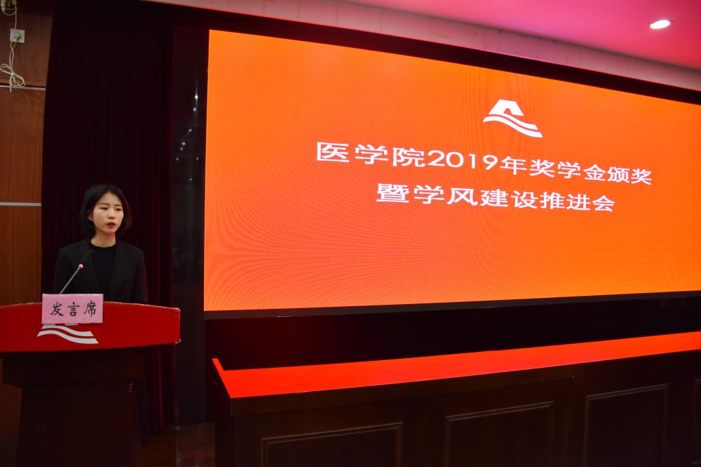 10月30日下午,学院举行2019年奖学金颁奖暨学风建设推进会。院党委书记夏瑞明、院常务副院长葛建荣、校对外联络处副处长夏婷,“金域奖学金”设立单位杭州金域医学检验所有限公司总经理郑伟、副总经理祝宇翀、营销总监黄桂根、总经理助理罗伟良、行政人力资源部招聘主管王红妹,“明峰奖学金”设立单位明峰医疗系统股份有限公司副总经理、明峰医疗设备有限公司总经理陈胜朝、明峰医疗系统股份有限公司绍兴区域经理孟飞烽,学院系部主任、书记、班主任、辅导员代表、获奖学生代表及在校主要学生干部参加。活动由院党委副书记金坚强主持。