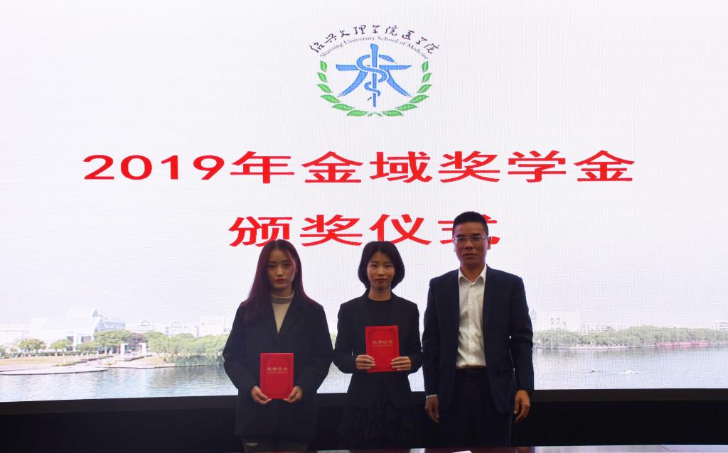 葛建荣宣读金域奖学金和明峰奖学金表彰文件,郑伟、陈胜朝为奖学金获得者颁奖。