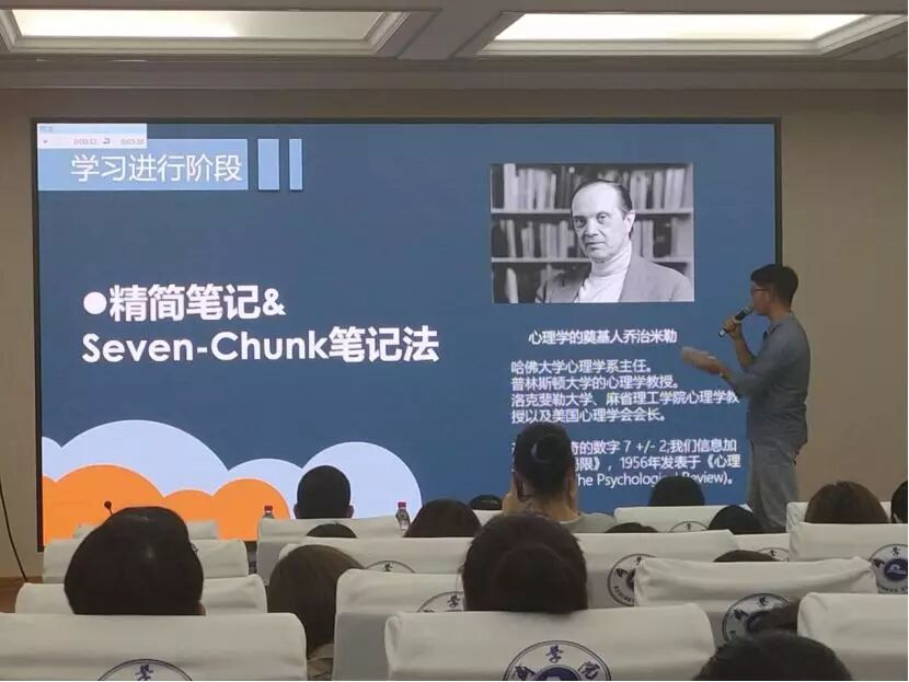 蔡治东同学针对日常学习生活中总会遇到的打不起精神、注意力难以集中等问题,分享了四个小技巧:一是记精力日记。通过记录不同时间段自己的精神状态,得到属于自己的精力曲线,从而更好地运用自己的精力。二借助仪式感。通过仪式感形成一个感觉锚点,创造一个与学习有关的条件反射。三是浓缩知识点。根据乔治·米勒的研究成果,我们可以把课上每一个知识点精简成7个以内的词块,一方面简洁明了利于记忆,另一方面能最大程度促进短时记忆向长时记忆的转化。最后是拒绝隐形消耗精力的休息。如玩手机等。若休息时间不够充裕,我们可以尝试做一些伸展运动,为大脑带来大量氧分子,迅速补充精力。