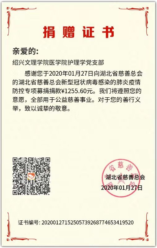 通过线上党支部号召,基础医学党支部和护理学党支部积极响应,全体师生党员不到两个小时自发缴纳了“特殊党费”4656元和1255.6元。以“绍兴文理学院基础医学党支”和“绍兴文理学院护理学党支”的名义,在线参与“湖北省慈善总会新型冠状病毒感染的肺炎疫情防控专项募捐”。