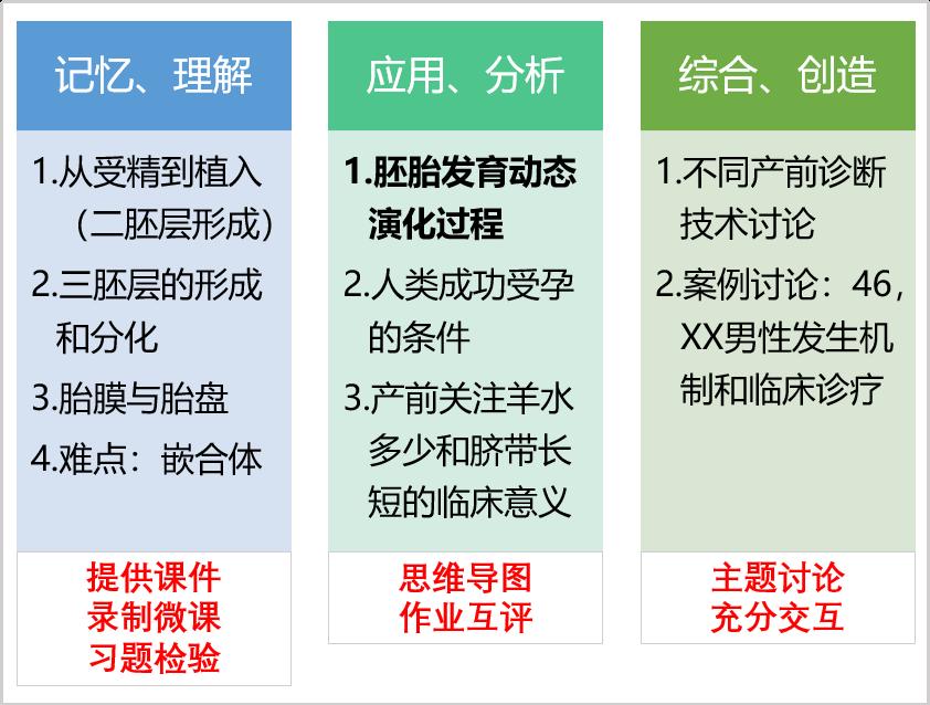 秉持着以“学习成效”为核心的教学理念,我将胚胎发育概论的学习内容按照布鲁姆学习分类法的层次要求分块(图5):对于记忆和理解层面要求的,主要通过推送课件、习题进行学习自查,对于难以理解的部分则录制微课供学生反复观看;涉及应用、分析学习要求的,主要通过主观题型的作业互评,以及思维导图的形式进行探讨学习,帮助学生学会学习和思考;关于评价(综合)、创造层面的,则通过充分的交互式讨论开展学习。学生线上进入讨论区发表不同看法,最终在课堂的同步学习中初步形成一致性观点,并且通过进一步的文献查阅,提出新观点。