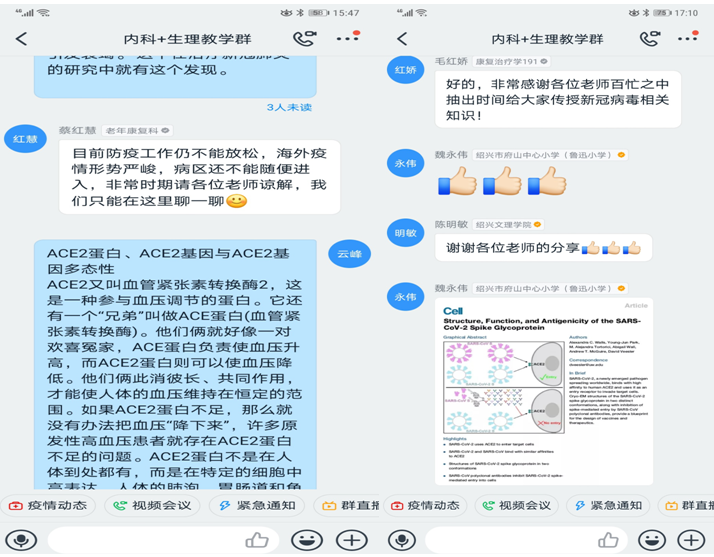 随后,双方开展了以“新型冠状病毒肺炎的预防与治疗”为主题的首次教研活动,分别从新发新型冠状病毒肺炎的生理学机制、临床表现、个人及团体的防护等方面展开交流。