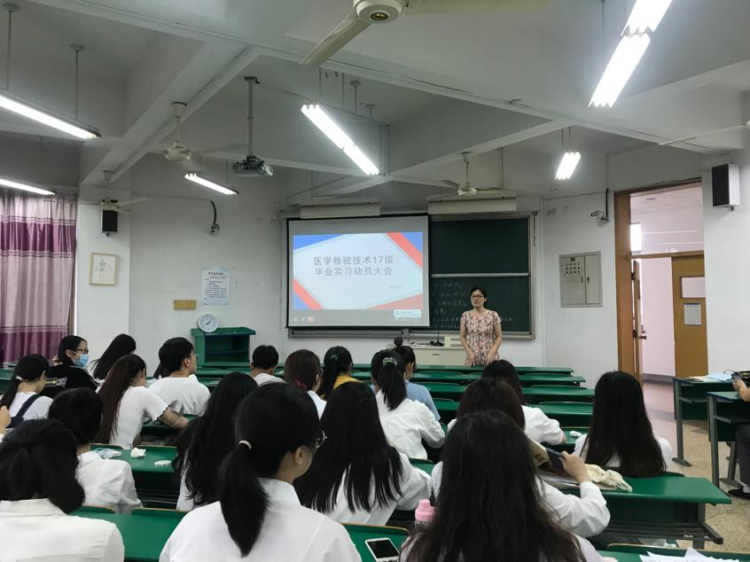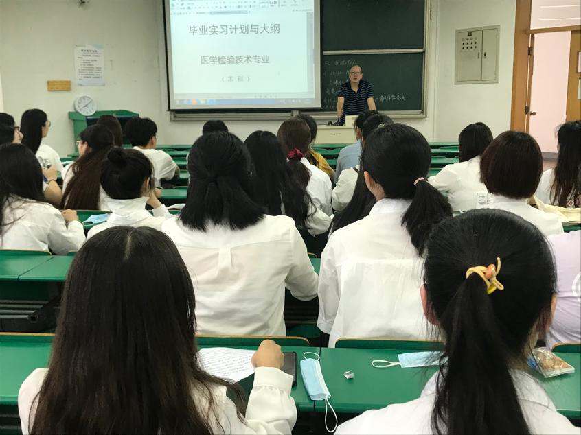 医学检验技术专业17级学生即将告别校园,进入毕业实习阶段。为了顺利完成实习任务,确保实习效果,医学检验系于2020年7月7日上午举行了毕业实习动员大会暨“业界精英进课堂”活动,大会由医学检验系副主任刘晓瑜老师主持。