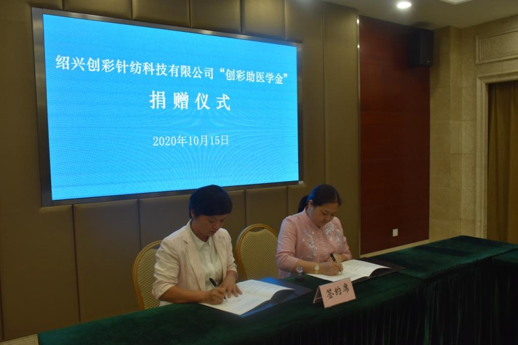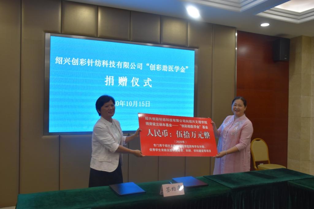 绍兴创彩针纺科技有限公司董事长王秋仙女士和绍兴文理学院对外联络处副处长夏婷签订捐赠协议。