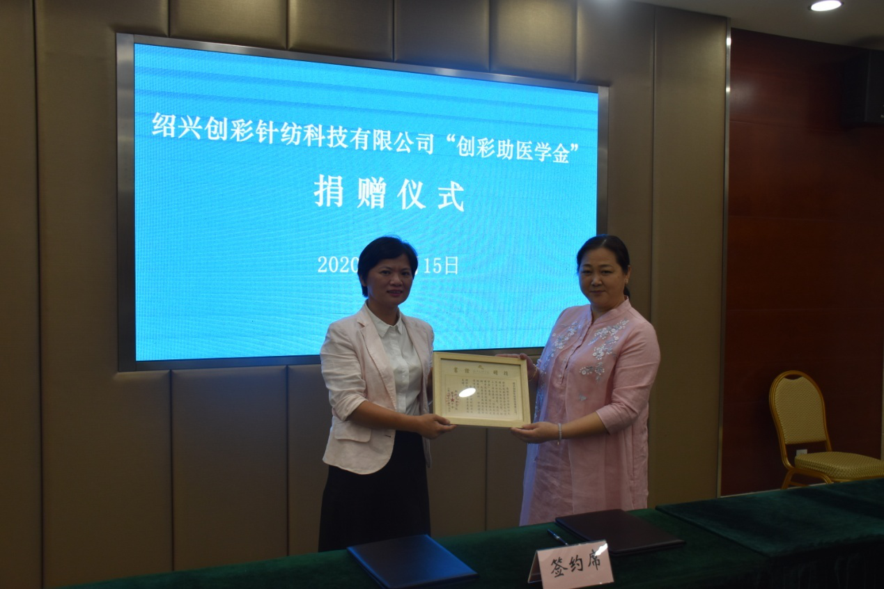 绍兴文理学院对外联络处副处长夏婷代表学校基金会接受捐赠,并向绍兴创彩针纺科技有限公司董事长王秋仙女士颁发捐赠证书。