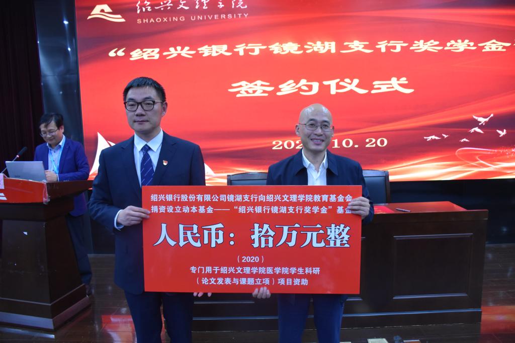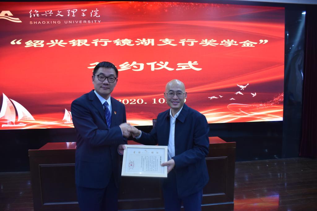 校对外联络处陈立处长与绍兴银行镜湖支行行长王建刚先生签署“绍兴银行镜湖支行奖学金”协议。王建刚行长向学校授予捐赠牌子,陈立处长代表学校基金会向绍兴银行镜湖支行授予捐赠证书。根据协议,绍兴银行镜湖支行向绍兴文理学院教育基金会捐赠10万元,专项用于开云电子竞技官方网站学生科研的奖励。