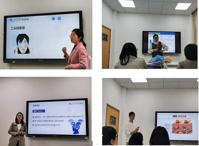 4位老师分别就风湿性心脏病二尖瓣狭窄、鼻饲喂养、需要和关怀理论、烧伤护理的相关内容进行了授课讲解。四位老师的授课各有风格和特点,教学方法采用多样,有结合学习通进行线上线下混合教学、有以案例为中心进行讲解、有以问题为导向进行设问引导的教学方法等等。