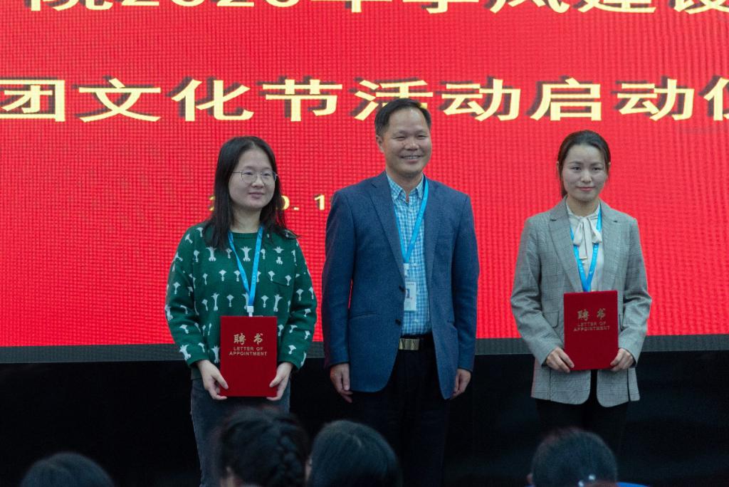 陈三妹副院长宣读了学生社团指导教师和2020级本科生班研究生助理文件聘任文件。