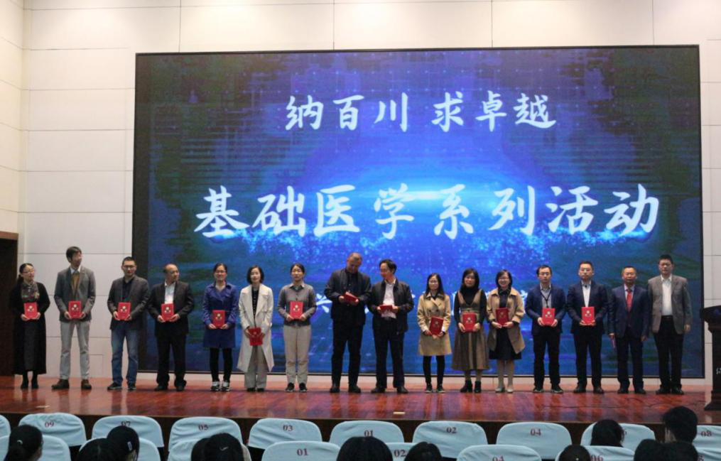 葛建荣常务副院长、陈佳玉教授、金欣博士、学生代表朱明了、陈之乐和徐炀同学共同启动开云电子竞技官方网站“纳百川 求卓越”基础医学系列活动。