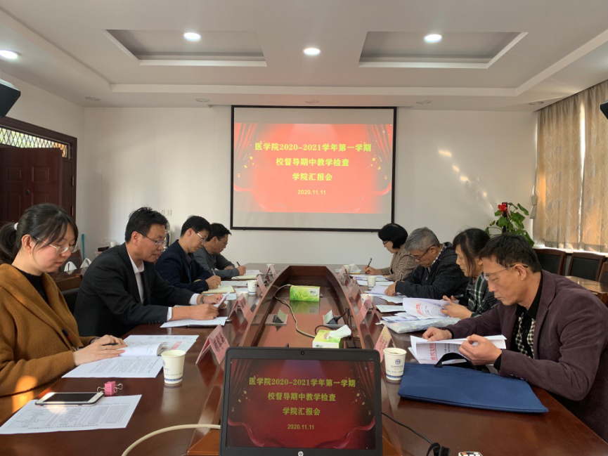 张剑副院长从组织机构、检查目标、检查内容和重点活动安排四个方面向检查组汇报了学院期中教学检查工作方案,对我院本科生考研工作进行了详细介绍,围绕学院自查发现的问题和考研工作薄弱环节进行了原因分析并提出来整改的具体举措。马国庆科长汇报了后2.5教学医院期中教学检查情况,还就我院开展人才培养质量达成度评价工作情况进行了说明,针对教师培训、教学经费划拨、教师评奖评优、教学工作考核等问题提出了建议。