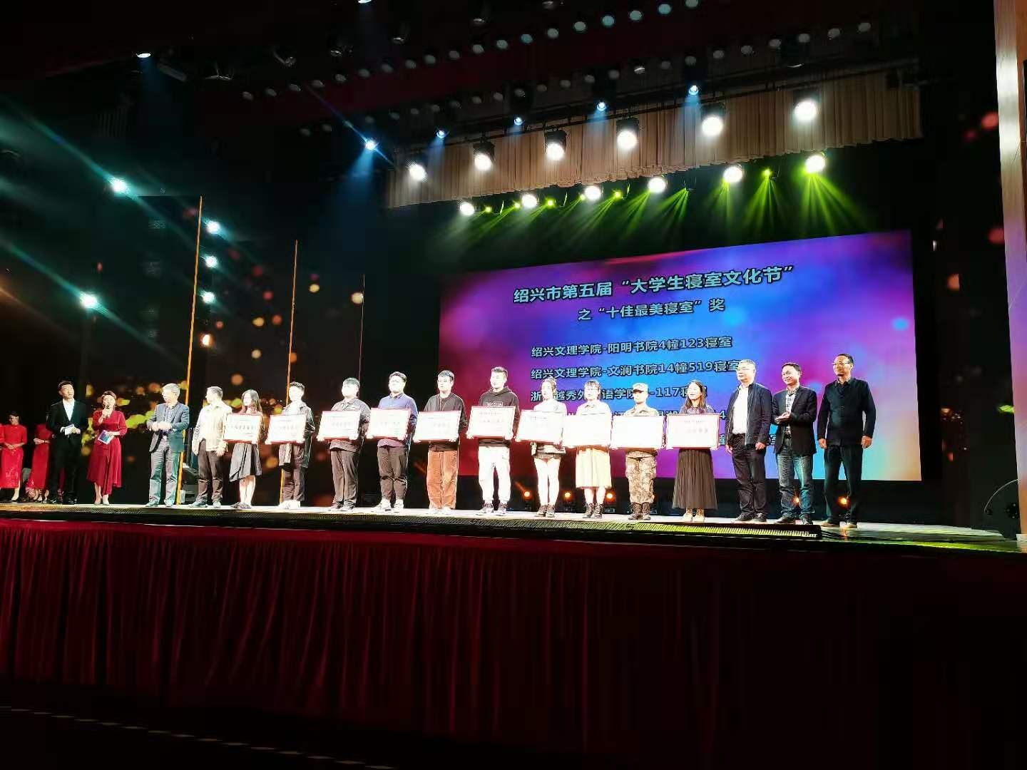 11月20日晚,由绍兴市委宣传部、市教育局、市新闻传媒中心主办,浙江工业职业技术学院承办的绍兴市第五届大学生寝室文化节颁奖展演活动在绍兴市文化中心隆重举行。绍兴市副市长顾涛,市人大副主任丁晓燕,市政协副主席胡少云,市教育局党组书记、局长姚国海,市委宣传部副部长杨伟卿,市新闻传媒中心副总编辑王存瑞,市教育局党委副书记、副局长马成永,市文联副主席车东海以及活动举办单位职能处室负责人,在绍高校相关领导、学工负责人等莅临现场。我院党委副书记金坚强、临床173班学生朱明了与其母亲黄燕萍、阳明书院公寓辅导员杨婧华受邀参加颁奖典礼。