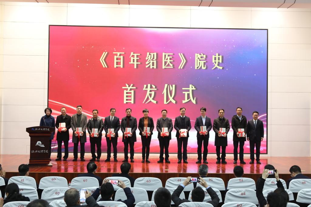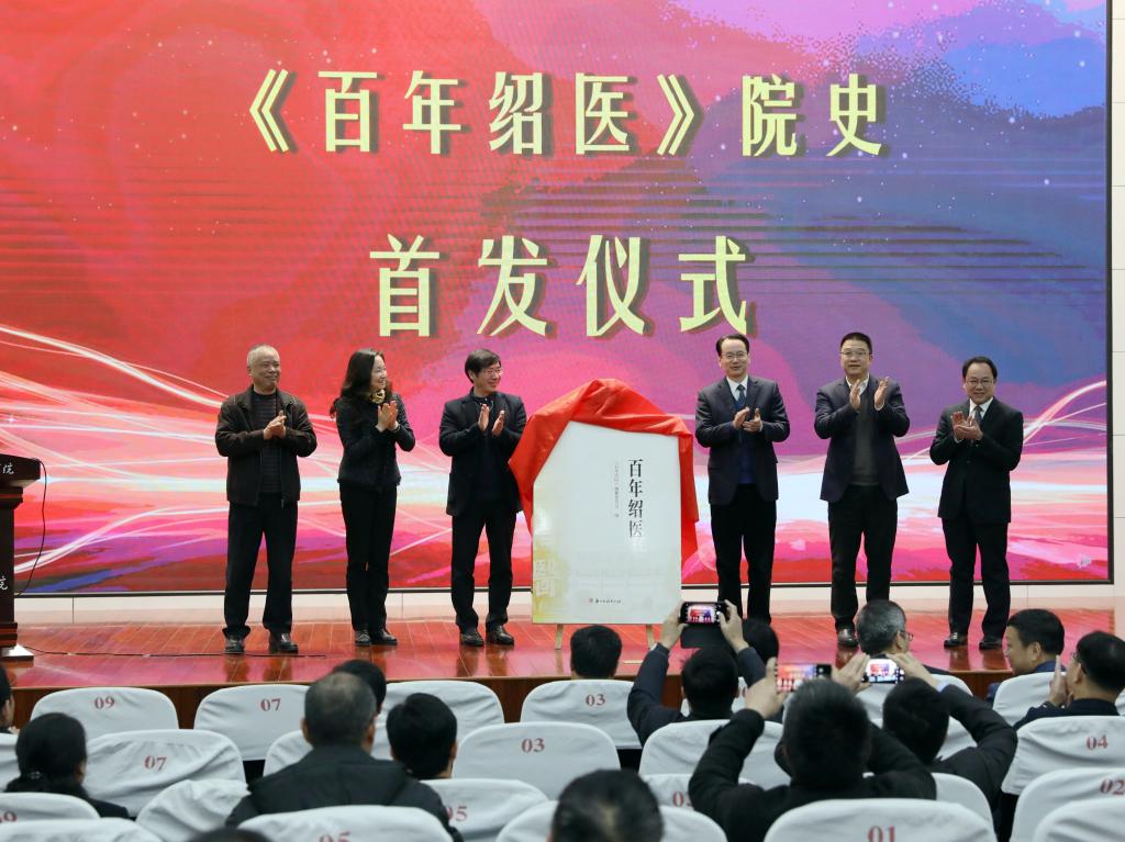在庆祝大会现场,举行《百年绍医》院史首发揭幕仪式并进行赠书活动。(院办公室)