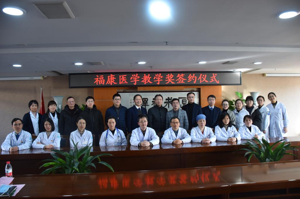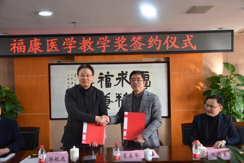 郭航远院长和葛孟华书记为福康医学教学奖签约。夏瑞明书记宣读《关于公布“福康医学教学奖”评审委员会名单的通知》。(院办公室)