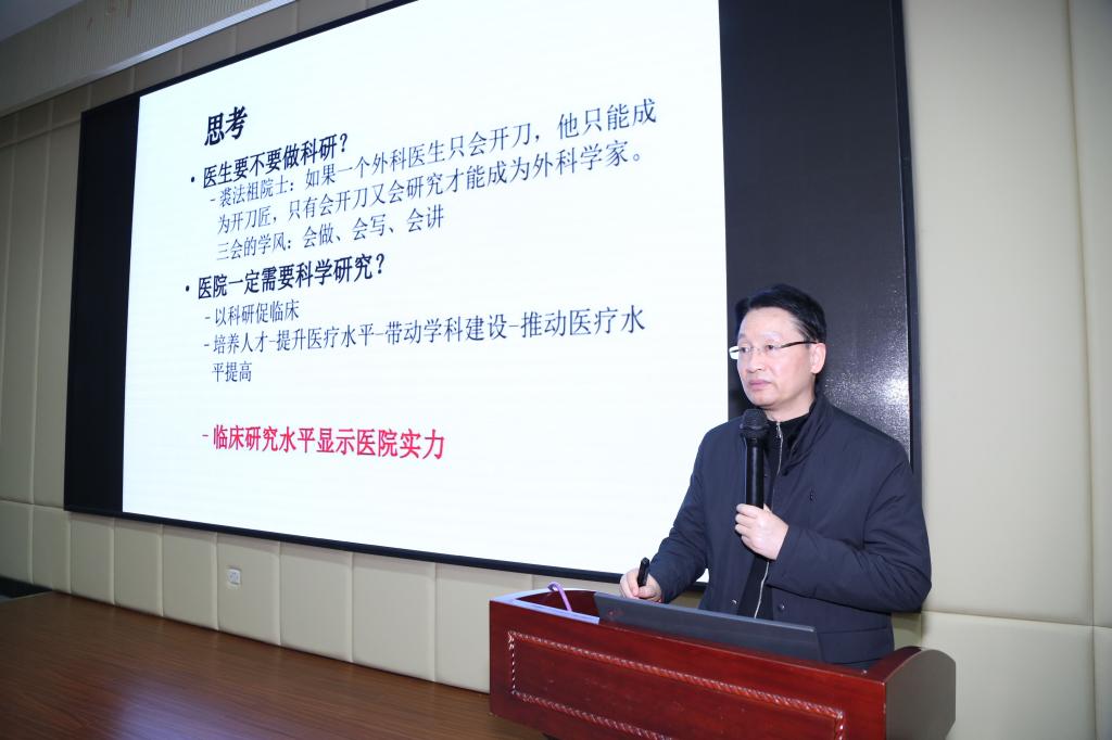 聘任会议结束后,郭航远院长为参会人员做了《科研工作的几个问题》专题讲座,详细阐述临床医生为什么要做科研、如何做科研、如何通过科研工作提升自我价值等关键问题。其次,强调每一位医生和高校教师都要有学术理想,要有情怀的去做科研,在做科研的过程中,要注重科研方向凝练、实验技术和科研素养提升、科研团队建设等关键性问题。最后,通过讲述自身学术成长经历为与会医生与教师上了生动的一课。