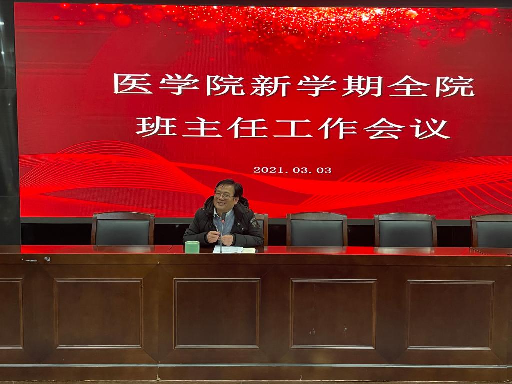 会议开始,金坚强副书记简要介绍了2021届毕业生今年考研过线率、2019届临床医学专业毕业生全国执业医师考试通过率、以及本科生SCI文章发表情况,并对全体班主任和辅导员的辛勤付出表示高度赞赏和感谢。随后,他传达了校学工会议精神,对开学学生安全返校、学工队伍建设、疫情防控、毕业班就业考研工作、重点关注学生帮扶等关键任务提出了具体要求。他围绕“一个体系、两个队伍、三个平台、四项工作”这一主线,就新学期开云电子竞技官方网站学工工作进行了重点强调和细致部署,他希望各位班主任和辅导员老师多关心关爱学生,用心工作,为学生核心竞争力形成及健康成长营造温馨适学氛围。
