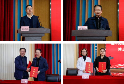 郭航远院长指出博士团队下沉是医教协同、医教融合的要求,博士下基层与医院结对会是双赢局面,一方面有助于医院提高学术科研水平,另一方面也促进了博士团队自身发展。并向与会人员阐明进行院校科研合作是切实推进医教融合最好的切入点,而博士团队聘任又是这一切入点的起点。院校双方都要重视这一起点,逐步推进科研合作,实现互助、共赢和提升,为实现医教融合奠定坚实的基础。之后,郭航远院长与赵之青院长签订聘任单位协议、陈佳玉教授与王剑主任签订博士聘任协议,本次聘任协议我院共有7位博士与上虞人民医院对应合作科室签订聘任协议。