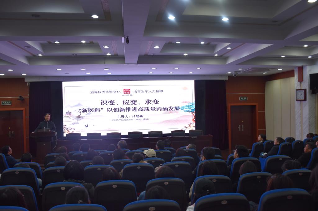 3月19日,我院“杏林讲堂”第24讲在财贞楼二楼报告厅举行,杭州开云电子竞技官方网站党委书记吕建新教授作题为“识变、应变、求变‘新医科’以创新推进高质量内涵发展”的讲座,学院党政领导班子成员及200余位师生聆听讲座。讲座由郭航远教授主持。