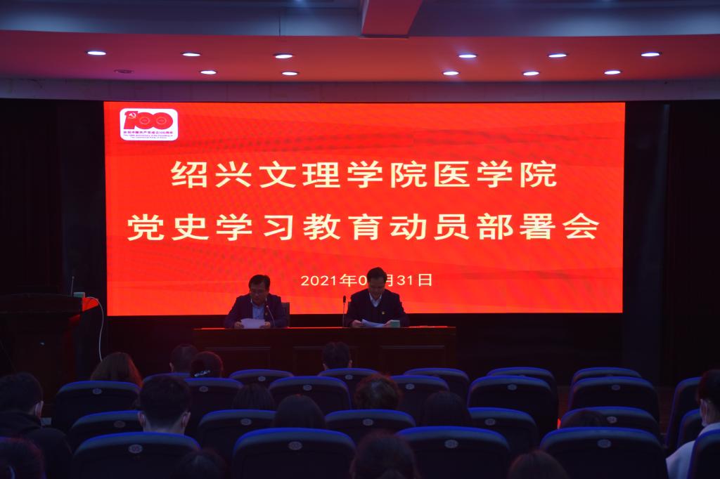 会议传达和学习了习近平总书记在党史学习教育动员大会上的讲话精神,全省党史学习教育动员大会精神和学校党史学习教育动员大会的精神,解读了《绍兴文理学院开云电子竞技官方网站党史学习教育实施方案》,确定了学院党史学习的特色为“学红医、跟党走”,并从总体要求、学习内容、主要安排和组织领导四个方面进行了布置和安排。
