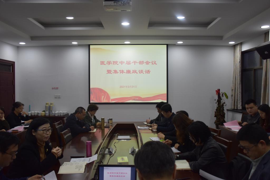 3月31日,学院在行政楼二楼会议室举行中层干部会议暨集体廉政谈话。学院党政领导班子成员、各系(部)、科室、中心负责人参加会议。会议由院党委书记夏瑞明主持。