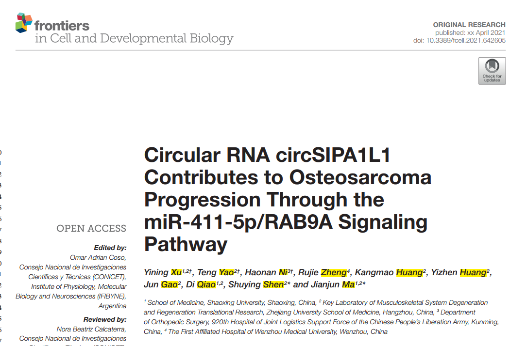 徐屹宁同学在导师马建军教授的指导下,通过对GEO 数据库进行数据挖掘,在circRNA芯片中筛选出了在骨肉瘤中差异表达的circRNA,并开展了一系列机制研究,发现了环状RNA circSIPA1L1可以通过内源性竞争结合miR-411-5p,来影响RAB9A的表达,从而调控骨肉瘤的进展,此外,该生还发现此环状RNA的表达水平也与骨肉瘤的临床分期有着密切关联。该发现有望为骨肉瘤的分子治疗提供潜在的治疗策略。徐屹宁同学随后撰写了题为Circular RNA circSIPA1L1 contributes to osteosarcoma progression through the miR-411-5p/RAB9A signaling pathway的学术论文,发表在Frontiers in Cell and Developmental Biology杂志上,该杂志的2020年影响因子有望突破6.5分。