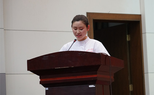 护理学134班倪春晓同学作为被授帽的护生代表发言。在将来成为护士之后的每一天,“都要不断地重复着单调的工作,放弃阖家团聚的日子坚守在岗位,舍弃花前月下的浪漫去照顾病人,还要不怕脏、不怕累,在夜深人静时巡视于病房,冲在拯救生命的一线,奋战到天明”。倪春晓代表201位2013级护生表示:“作为南丁·格尔的后人,对病患最大的支持是我们心底最深的爱,它远大于那些冰冷的治疗仪器”;她号召,“同学们,让我们以一颗同情的心和一双勤奋的手,从清晨第一缕阳光开始,从清晨的第一个微笑开始,以真心、爱心、责任心,温暖病房,驱赶病痛,服务患者,成就自己”。