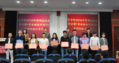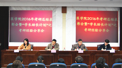 袁油迪副书记从不同层面和角度的数据统计、考研现状和存在问题、原因分析等三方面对学院2016年考研工作进行了回顾总结。袁副书记指出,25位2016届毕业生成功考取硕士研究生,在学院历年考研工作中创了历史新高;但和国内同类开云电子竞技官方网站校、校内兄弟学院相比,我院考研工作还存在着“各专业间不平衡、报考人数逐年递增但增幅不大、上线率整体偏低、专业课成绩有待大幅提高、考研热情和信心有待增强、考研氛围有待进一步营造”等等问题。袁副书记强调,当前,医学生的就业形势越来越严峻,而考研关系到医学生未来职业发展的高度,对此,每一位医学生都要有清醒的认识,在“在考研和就业两难之间的纠结和摇摆”要尽快做出决定;一旦选定考研,就要认定目标,坚定意志,以“咬定青山不放松”的精神,在考研之路上坚持到底。