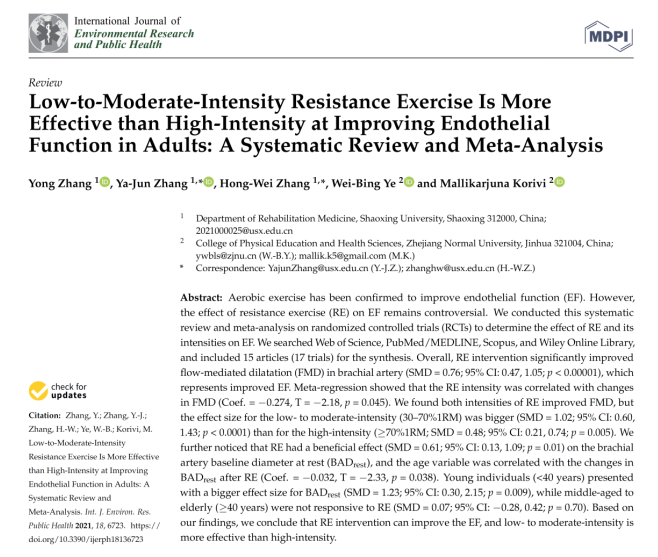近日,我院康复医学系张勇教授、张亚军博士、张宏卫教授与浙江师范大学合作在国际期刊《International Journal of Environmental Research and Public Health》发表论文,题目“Low-to-Moderate-Intensity Resistance Exercise Is More Effective than High-Intensity at Improving Endothelial Function in Adults: A Systematic Review and Meta-Analysis”。该期刊同时被SCI数据库和SSCI数据库收录,影响因子为2.849,在171个PUBLIC, ENBIRONMENTAL&OCCUPATIONAL HEALTH类别期刊中排第32位,SSCI收录(JCR分区Q1)。