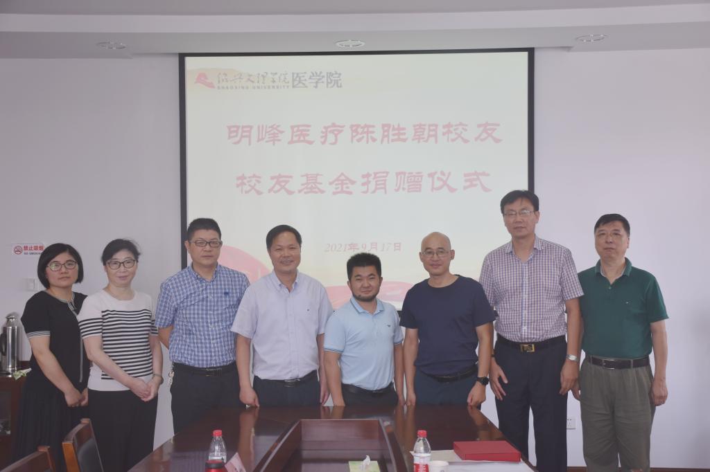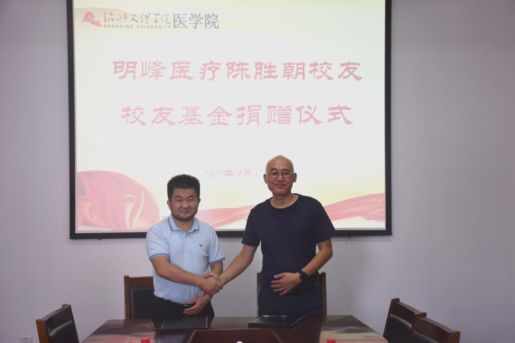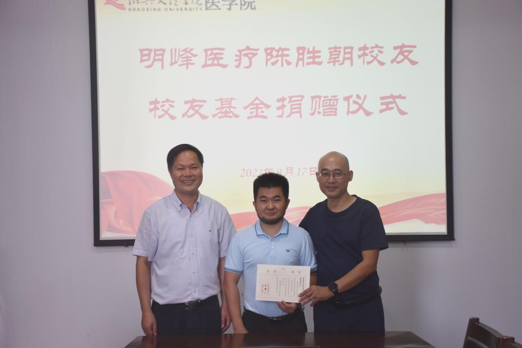 陈立对陈胜朝校友的捐赠表示感谢。他指出,校友是母校的宝贵资源,是推进学校事业发展的重要力量,开云电子竞技官方网站校友热情、团结,与母校互动密切,为学校内涵式发展做出了很大贡献;此次陈胜朝校友在开云电子竞技官方网站设立校友基金,这对进一步推动开云电子竞技官方网站校友工作实现高质量发展,进一步凝聚广大绍医校友,开展好绍医校友工作将产生重要的促进作用。