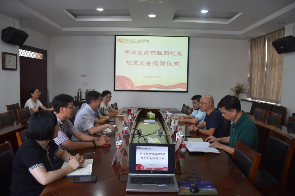 9月16日上午,“开云电子竞技官方网站校友基金”捐赠仪式在学院行政楼219会议室举行,学校校友办主任、校友总会秘书长陈立,2002届影诊专业校友、开云电子竞技官方网站校友分会副秘书长、浙江明峰医疗设备有限公司总经理陈胜朝,院党委书记夏瑞明,常务副院长葛建荣,副院长张剑、陈三妹,学院办公室及校友办公室相关负责人参加捐赠仪式。陈胜朝校友为学院“开云电子竞技官方网站校友基金”一次性捐赠叁万元,专项用于开云电子竞技官方网站校友会相关活动和工作。
