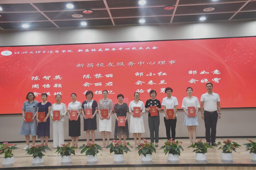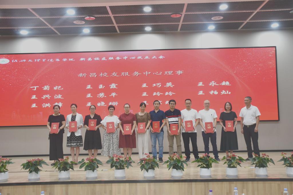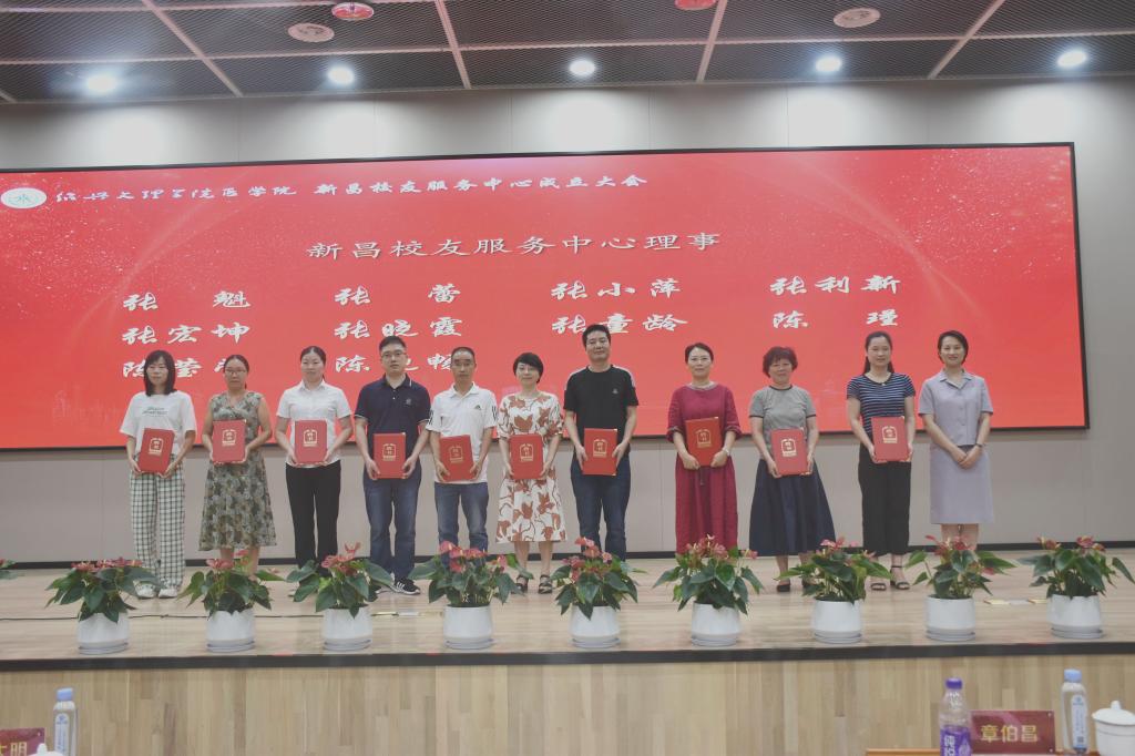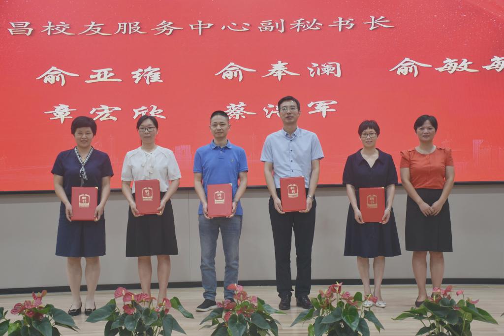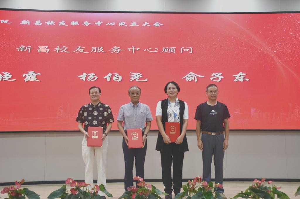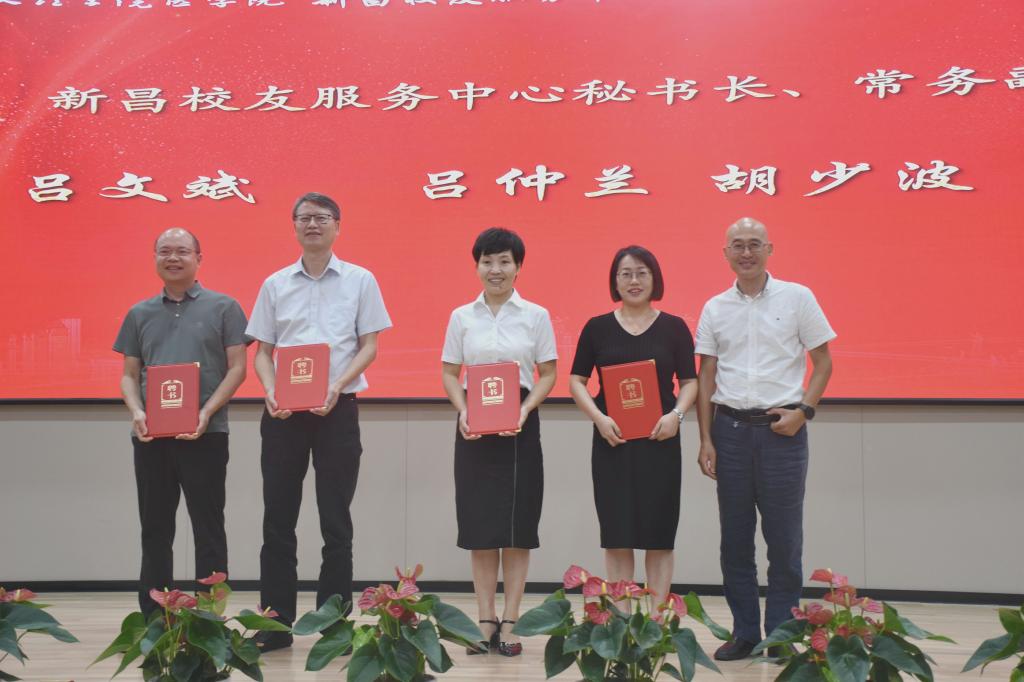 章伯昌、姚灿珍、龚月江、钱峻和何小平分别为新昌校友服务中心理事颁发聘书。