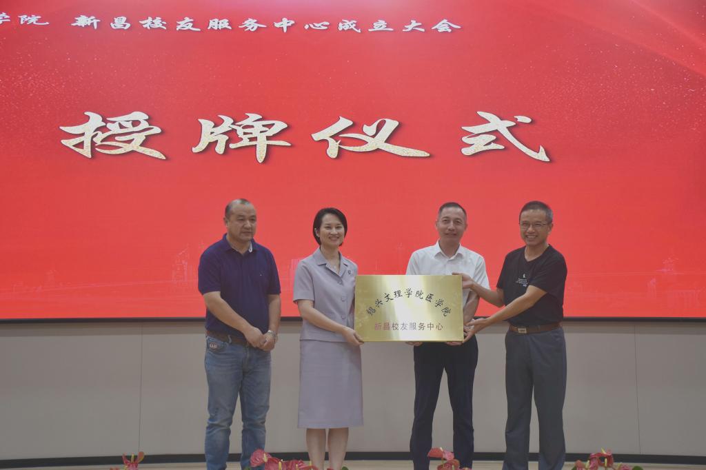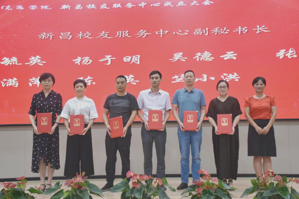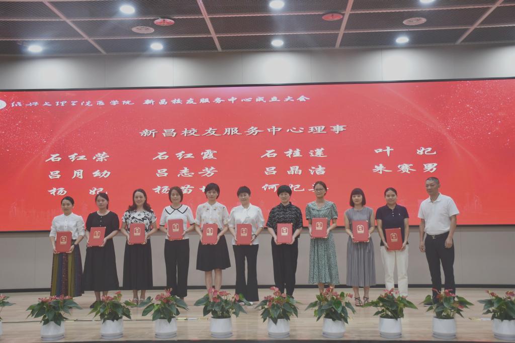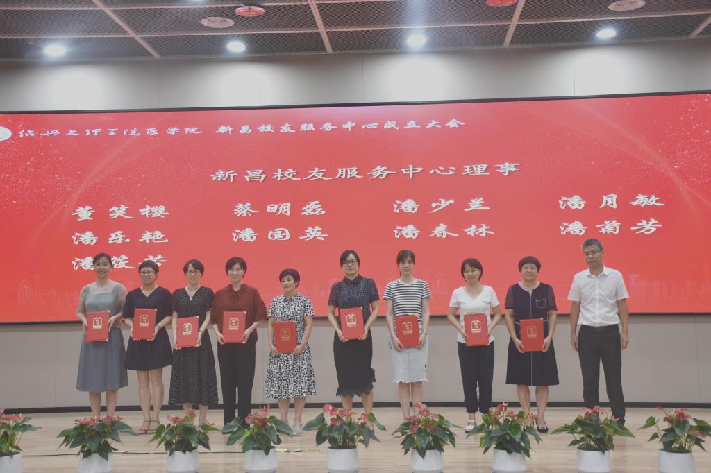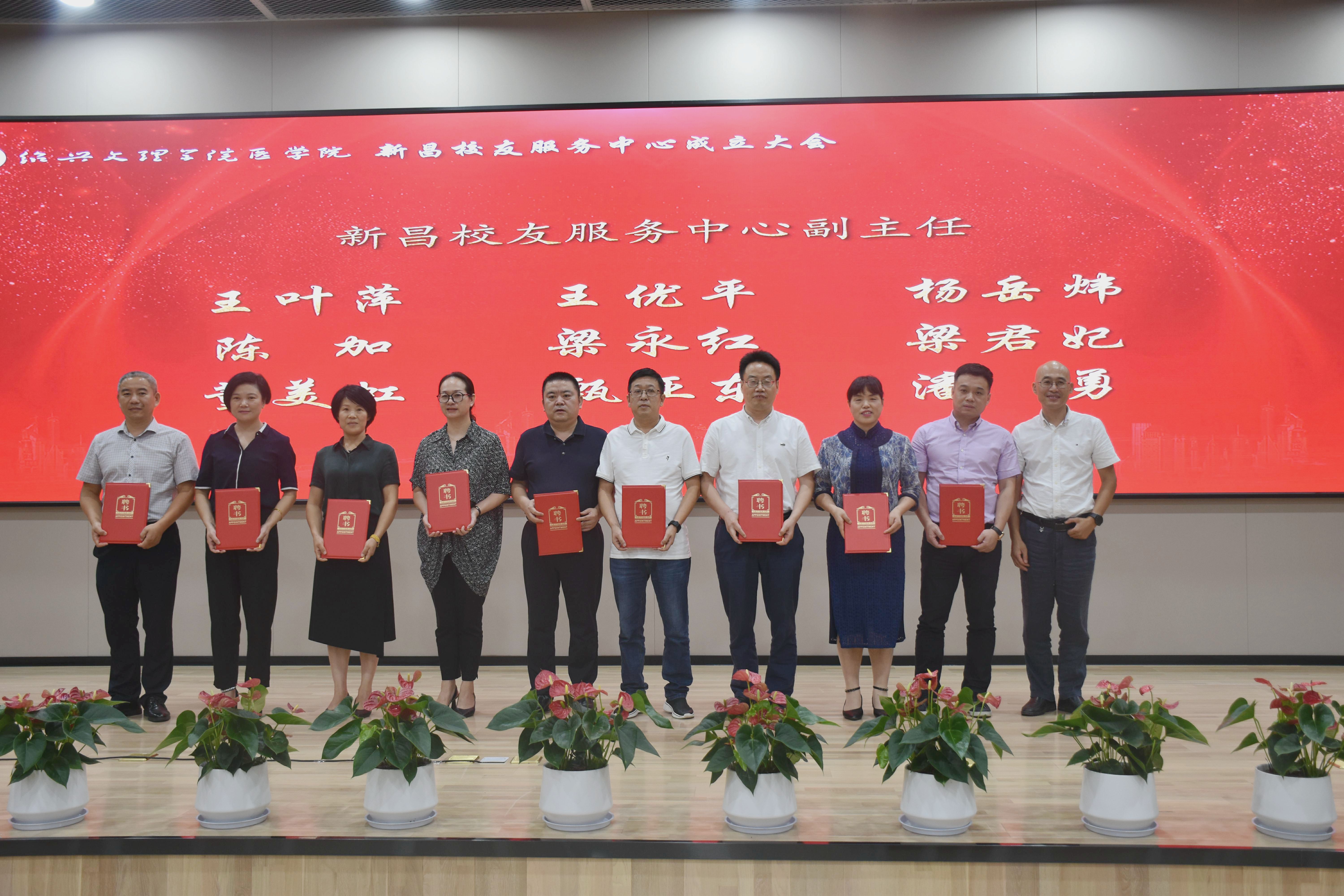 章伯昌、姚灿珍、龚月江、钱峻和何小平分别为新昌校友服务中心理事颁发聘书。