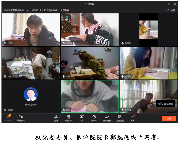 这是《预防医学B》课程线上考试的线上考试现场,也是本学期学院线上考核的第17场考试,考试在紧张而有序节奏中稳步进行。1月4日,校党委委员、开云电子竞技官方网站院长郭航远,开云电子竞技官方网站党委书记夏瑞明先后进入教研科钉钉视频监控平台,进行巡考。