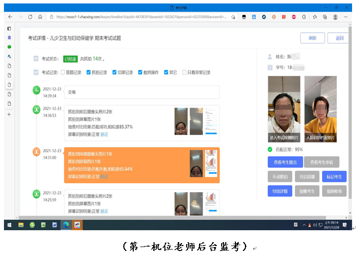 “老师,能看到我吗?我的电脑这样放置可以吗?”1月4日下午13时30分,临床医学(卓越医师)193班陈卓能同学进入钉钉平台视频会议,在第二机位监考老师张华芳指导下不断调试监控自己考试环境的电脑摄像头角度;14时25分,陈卓能同学进入超星学习通平台,点开考试通知、阅读考试注意事项、进行人脸识别验证;14时30分,考试正式开始,第一机位监考教师邢海燕通过电脑屏幕,在学习通后台认真比对考生考试信息,时刻关注线上考试考场动态。