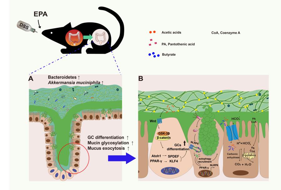 ► EPA可增强结肠黏液屏障驯化肠道微生物,促进产短链脂肪酸菌群丰度为结肠上皮细胞提供能量物质;