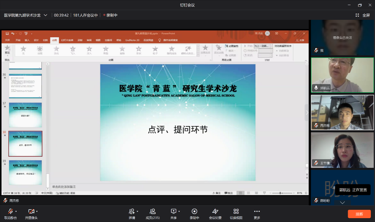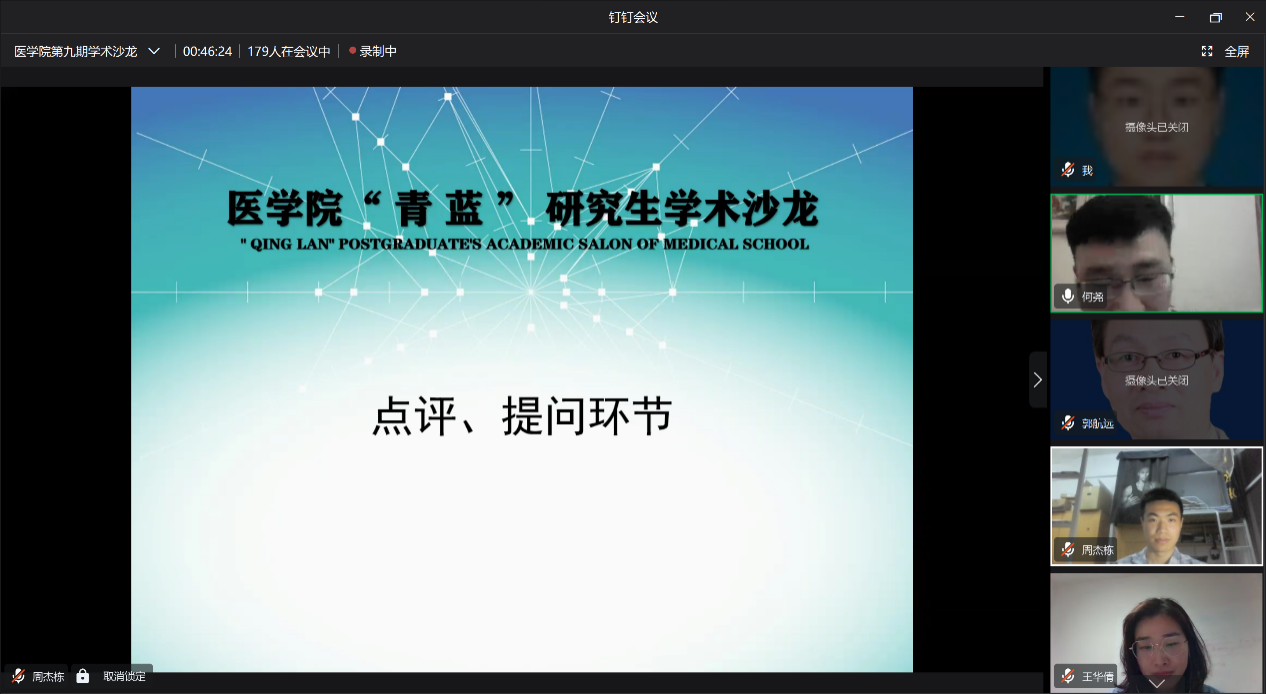 3月16日晚,学院第九期“青蓝”研究生学术沙龙活动通过钉钉平台在线上开展。本次沙龙的特邀嘉宾为郭航远教授、何尧主任医师、邢海燕教授和屠慧惠博士。沙龙主讲人分别为我院2020、2021级临床医学专硕研究生王华倩、周杰栋同学。