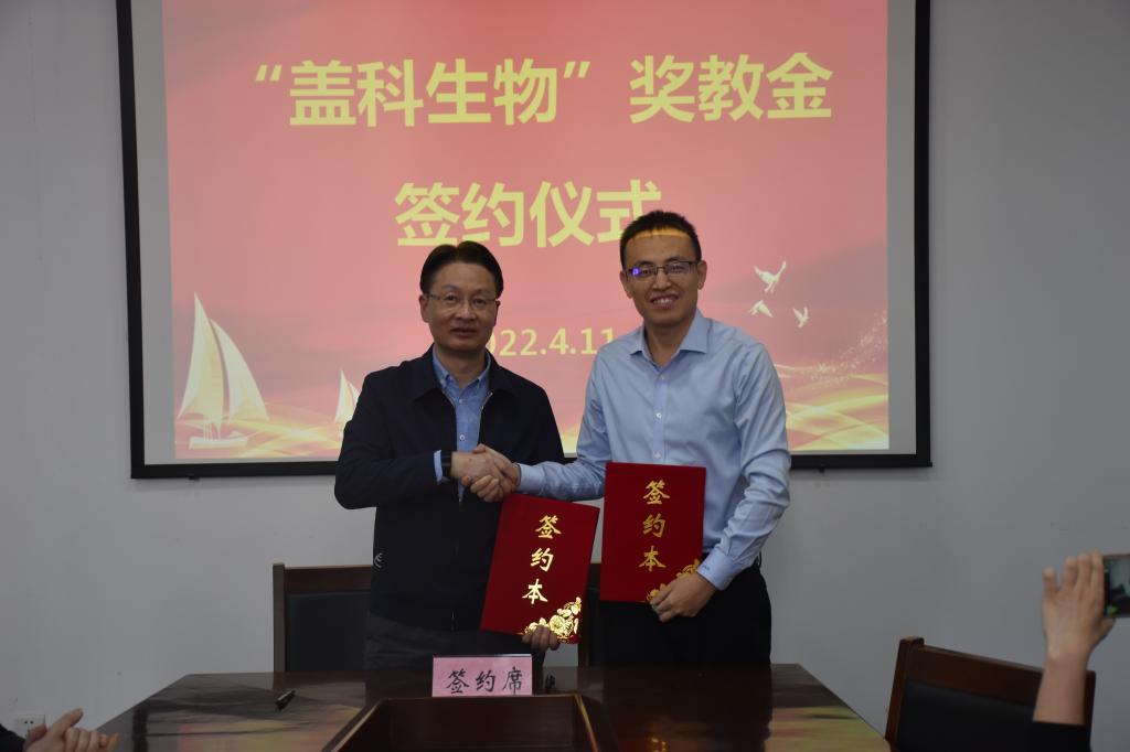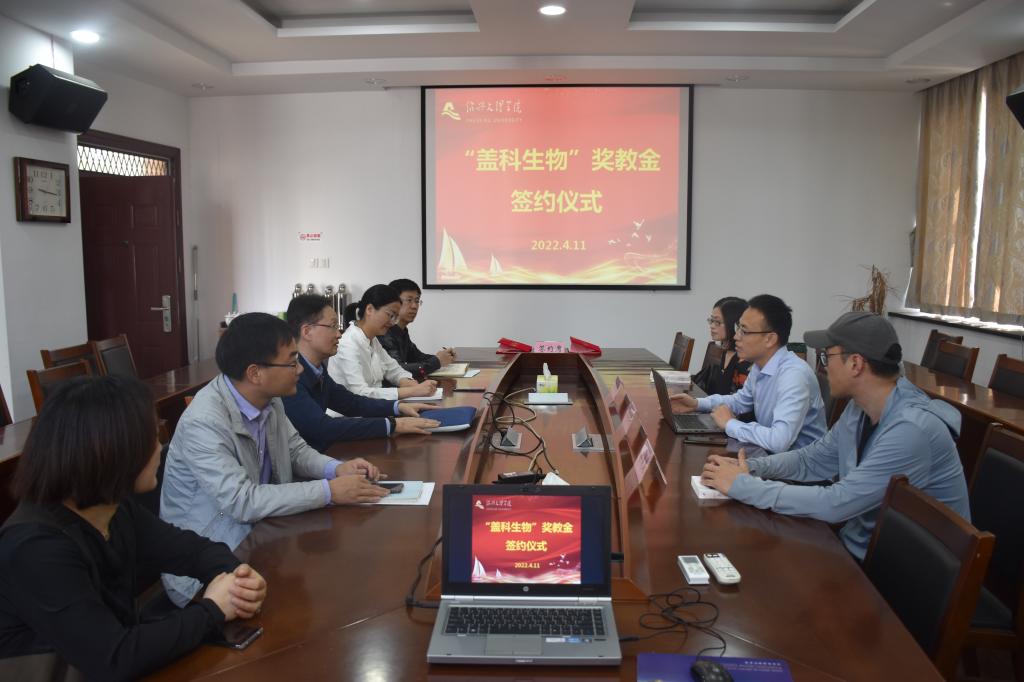 4月11日上午,“盖科生物”奖教金签约仪式在学院行政楼219会议室举行,学院院长郭航远,盖科生物科技(绍兴)有限公司CEO赵仕芳博士,学院办公室、教研科、医学科研中心相关负责人,盖科生物科技有限公司相关人员参加签约仪式。