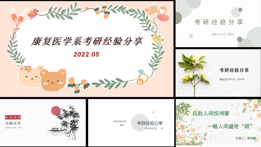 为激励2019、2020级学生的学习兴趣,提前做好职业和学业规划。康复医学系邀请考研录取学生分享他们的成功经验。五位学生制作了精美的PPT,用简单而内容丰富的语言,讲述他们各自的考研初心和复习迎考心路历程,着重在学校选择、复习迎考与生活、考研与实习关系的协调等方面进行了经验分享,蔡洋同学还分享了自己研究生调剂的心得体会。他们希望2019级同学门能坚持自己的初心使命,努力拼搏,一站成硕。
