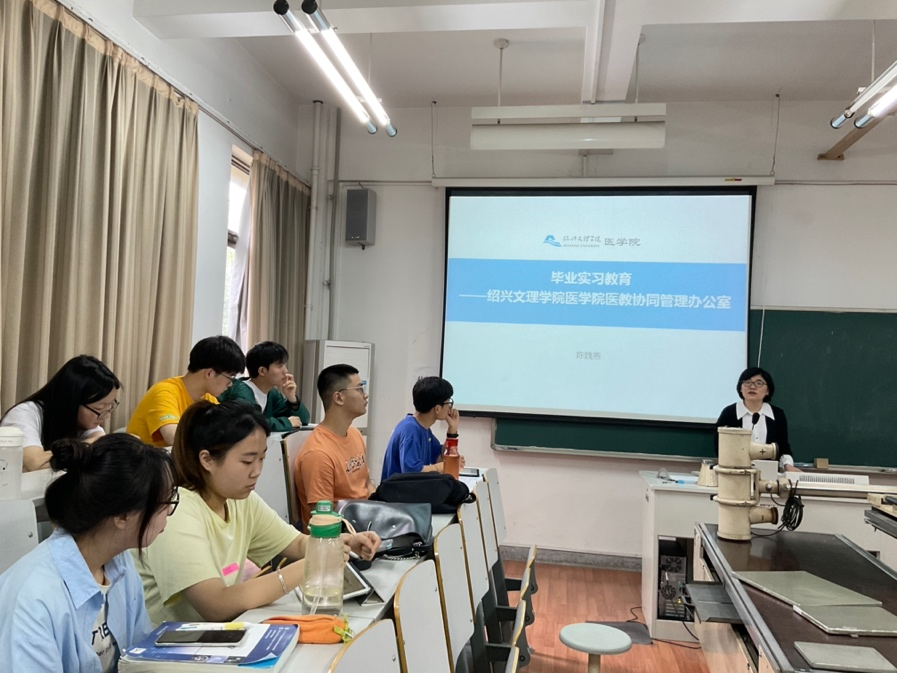首先医教协同办陈魏燕老师介绍今年的实习安排情况、见习和实习期间相关的规章管理制度以及最近在柯桥发生的新冠肺炎疫情形势。会上要求全体同学在实习阶段要遵守学校和医院的双重管理制度,疫情期间做好个人防护,并对实习学生进行劳动安全、交通安全和法制教育,督促学生严格遵守实习单位的安全规定及保密规定,重视病人的隐私。