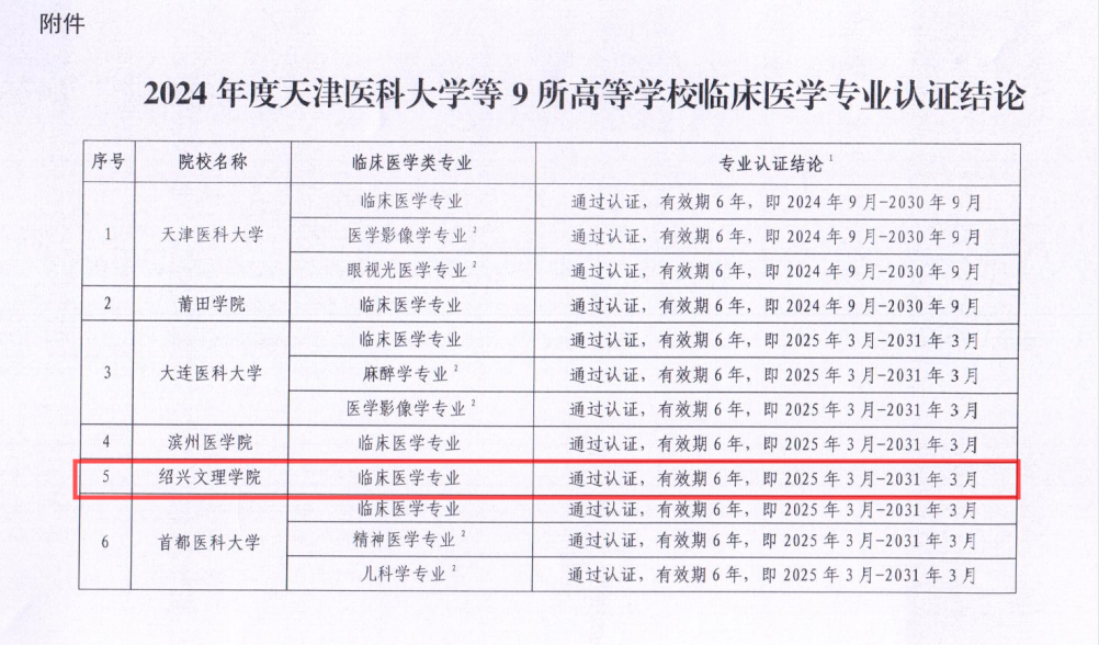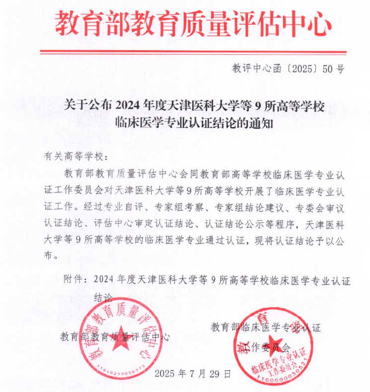 近日,教育部教育质量评估中心与教育部临床医学专业认证工作委员会联合发布《关于公布2024年度天津医科大学等9所高等学校临床医学专业认证结论的通知》(教评中心函﹝2025﹞50号),正式对外公布了9所高等学校临床医学专业认证的结论。其中,我校临床医学专业凭借扎实的教育基础与良好的办学成效,成功通过此次认证,认证有效期为6年。