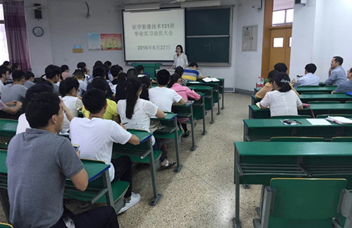 6月27日下午,医学影像技术专业2017届毕业生毕业实习动员会在财贞楼415教室召开。副院长陈三妹,校直属附属医院党委副书记、医学影像系主任、影像医学与核医学学科副主任夏瑞明,影像医学与核医学学科主任、超声教研室主任夏国园,医学影像系副主任、附属第二医院放射科主任徐宏伟,附属第二医院放疗科主任、医学影像系放射治疗教研室主任王思本,医学影像检查技术教研室主任胡劲松,教研科习正,以及医学影像技术专业2017届全体学生与会。会议由该系系主任马玉富主持。