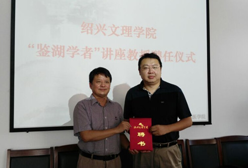 沈赤为陶然教授颁发“鉴湖学者”讲座教授聘书。