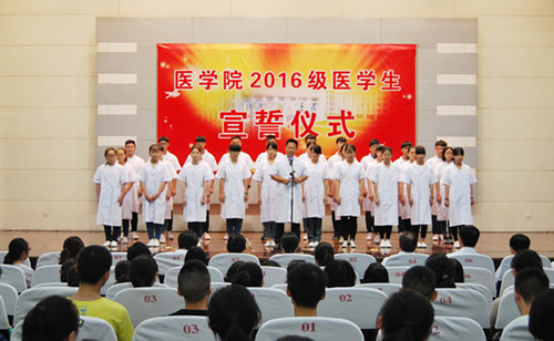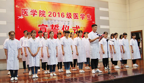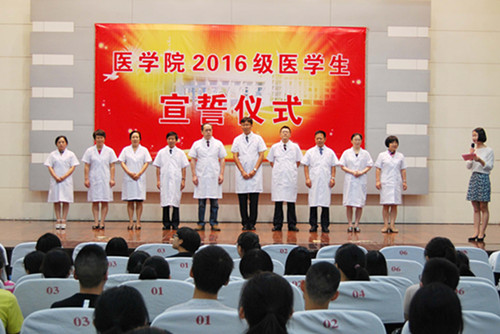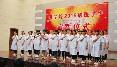 在领誓人黄丹文主任医师教授的带领下,全体2016级新生将右手放在左胸前庄严宣誓,决心为祖国医药卫生事业和人类的身心健康奋斗终身。
