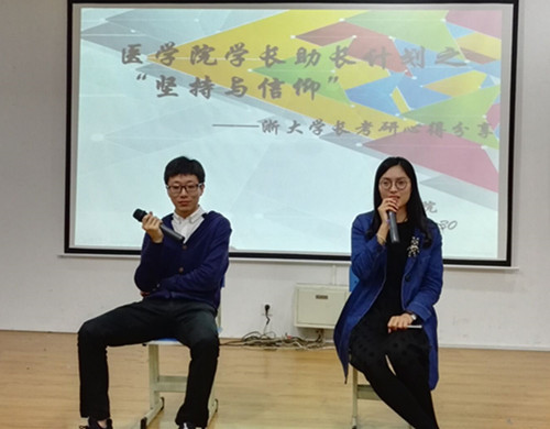 为深化学院学生考研氛围,加强学生对考研的认知,我院“学长助长计划”系列活动之“坚持与信仰”——2016届优秀校友考研分享会于10月30日在财贞楼一楼报告厅举行。现就读于浙江大学的硕士研究生、我院临床医学111班林黎明和临床医学112班郑沛栋受邀回到母校,与学弟学妹分享他们的考研、读研心得。我院有考研意向的、正在备考的160多位同学参加了此次分享会。