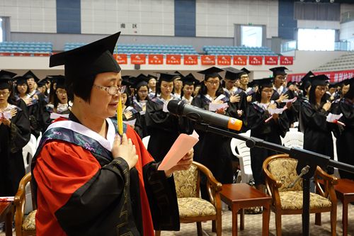 毕业典礼上,在黄丹文老师领誓下,医学生重温医学生誓言——
