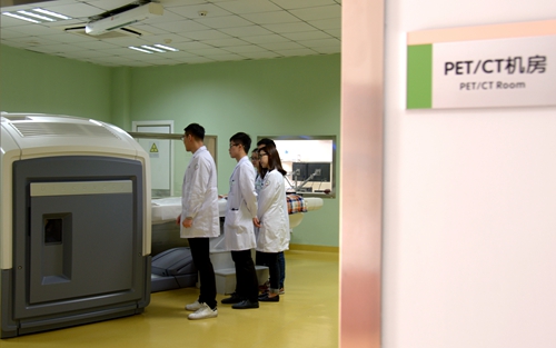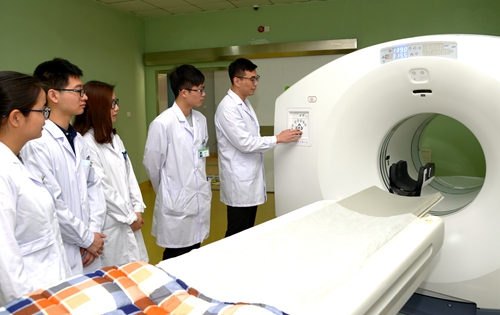 本专业拥有优越的实践教学条件。下图为学生在附属第一医院临床教师指导下操作PET/CT。
