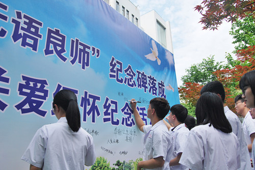 活动最后,全体人员依次向“无语良师”纪念碑敬献鲜花,并在追思板上写下对“无语良师”的崇敬之情和感恩之心:“感恩生命”“感恩奉献”“奉献者的生命最美”“感谢最美的老师”“大爱无疆”……